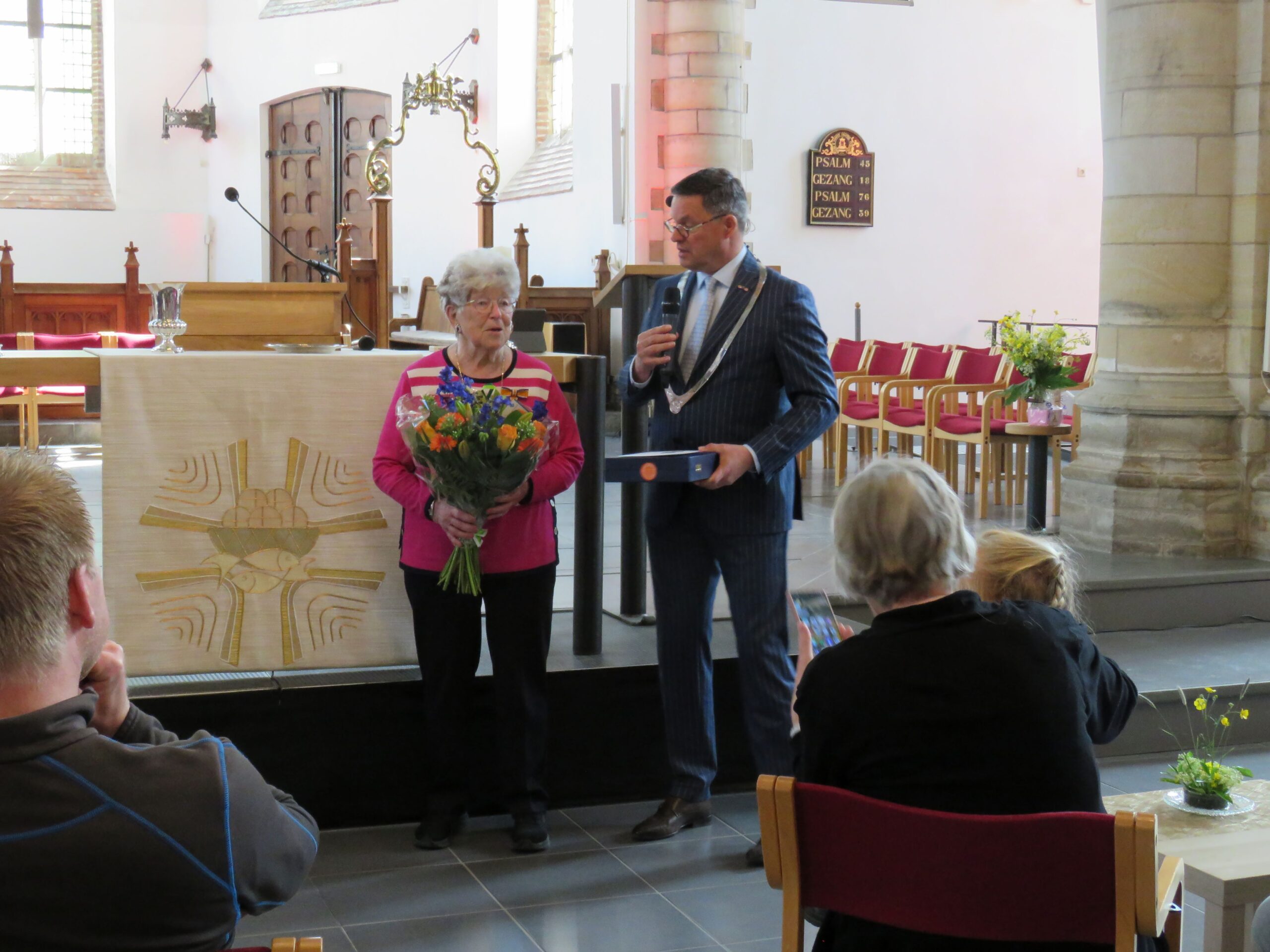Clary Leeftink ontving de onderscheiding van de burgemeester van Vlissingen in de Sint Jacobskerk waar ze al meer dan 20 jaar vrijwillig actief is in verschillende functies. Onder het voorwendsel van een cursus voor omgaan met de tablet voor de muntverkoop tijdens concerten en de boetiek tijdens de kerkopenstelling en onder aanwezigheid van mede-vrijwilligers en haar familie werd ze verrast. Het is zeker dat deze heuglijke gebeurtenis haar nog lang bij zal blijven.